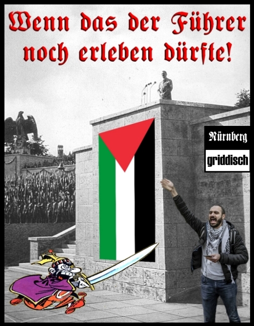 Besonders apart im Publikum sind die Kinder mit kleinen Pali-Fahnen, die sicher wissen, was da abgeht. Man erinnert sich unweigerlich an die Bilder ihrer Altersgenossen, die bei Paraden der Hamas im Gazastreifen in süßen Mini-Uniformen mit Plastik-MPs mitmarschierten - auch eine Art der Erziehung. In sicherem Abstand lachen sich wie üblich namenlose Polizisten in freundlich aggroschwarzen Uniformen kaputt - wohl nicht über die Sprüche vom Podium, sondern den gelungenen Witz eines Kollegen. Der brüllende Blutsbruder wird trotzdem nicht nach Gaza zum Kämpfen fahren, sondern den erfolgreichen Tag mit seinen Habibis gemütlich in einer Nürnberger Shisha-Bar ausklingen lassen. Da passt es gut, dass ein Krimskramsladen um die Ecke seinen Bandana-Ständer komplett mit Palitüchern umdekoriert hat. Am 7. Oktober hingen da keine Israel-Fahnen. Ist es […] zu verwundern, wenn die von den Juden gequälten und gereizten Araber sich ihrer Quälgeister zu erwehren und zu entledigen suchen? Wenn sie in ihrer Verzweiflung ihr Leben und das ihrer Familie - wenn auch manchmal durch ungesetzliche Mittel - zu retten versuchen. Wenn sie jüdische Grundstücke in Flammen aufgehen lassen und ihre Waldungen vernichten? Wenn sie die vielen Morde, an ihren Brüdern durch Juden begangen, auch durch einzelne jüdische Opfer zu rächen versuchen? […] Diese Verheißung [von der Unterwerfung aller Ungläubigen durch den Messias] muss jeder Nichtjude kennen, so wie sie auch das Arabervolk kennt, das die Entfernung der jüdischen Heuschreckenplage verlangt! Und ein Volk, das die Entfernung der Juden fordert, fordert ja letzten Endes nur seine Freiheit! Dieses Zitat stammt nicht von dem Sprecher auf der Demo, sondern stand vor 87 Jahren im Stürmer. |